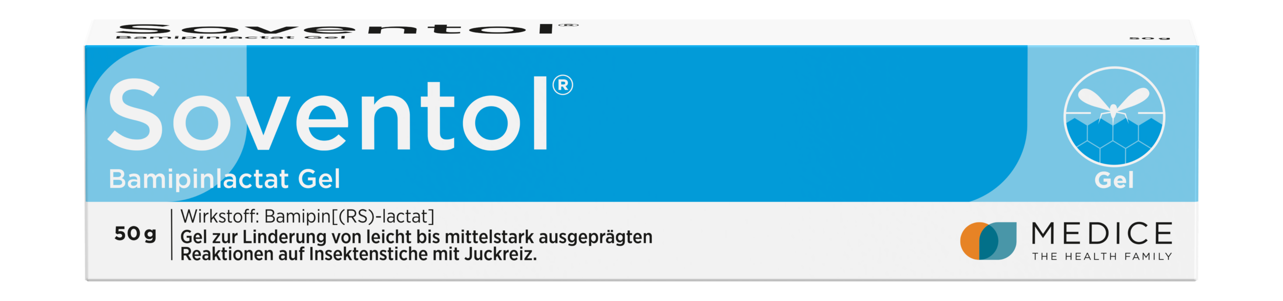 Bei Insektenstichen aller Art nimmt Soventol® Bamipinlactat Gel die Rötung und lindert den Juckreiz. Der Klassiker für die ganze Familie wirkt schnell und langanhaltend zugleich. Nur Soventol® Bamipinlactat Gel enthält das Antihistaminikum Bamipin, dessen schneller Wirkeintritt und langer Wirkeffekt mehrfach studienbelegt ist.
